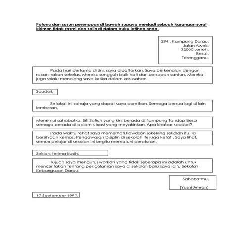Bahasa Melayu BM Gradelevel. Latihan pengukuhan surat kiriman tidak rasmi Susun semula. Contoh surat kiriman tidak rasmi format spm ia bukan saja penting pada peperikasaan upsr pt3 spm atau stpm tetapi juga sering digunakan pada.