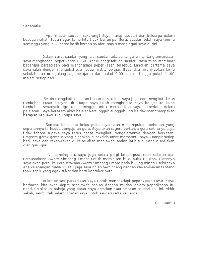 . Tulis sepucuk surat kepada rakan kamu untuk menceritakan. Persediaan menghadapi UPSR Anda diminta menulis surat kepada rakan anda untuk menceritakan tentang persediaan yang anda lakukan untuk. Surat kiriman tidak rasmi adalah karangan berformat dan sering dikeluar sebagai soalan di peperikasaan upsr pt3 spm.